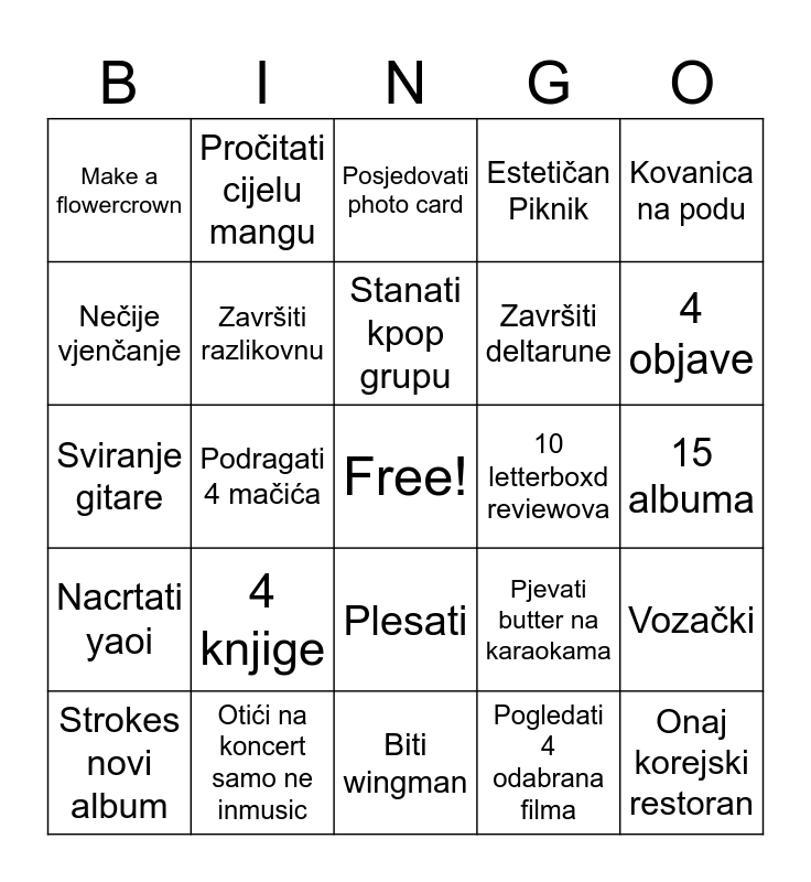This bingo card has a free space and 24 words: 4 knjige, Otići na koncert samo ne inmusic, Stanati kpop grupu, Strokes novi album, Kovanica na podu, Make a flowercrown, Nečije vjenčanje, Pročitati cijelu mangu, 10 letterboxd reviewova, Plesati, Završiti deltarune, Sviranje gitare, Pjevati butter na karaokama, Vozački, Završiti razlikovnu, Pogledati 4 odabrana filma, 15 albuma, Posjedovati photo card, 4 objave, Podragati 4 mačića, Onaj korejski restoran, Nacrtati yaoi, Estetičan Piknik and Biti wingman.