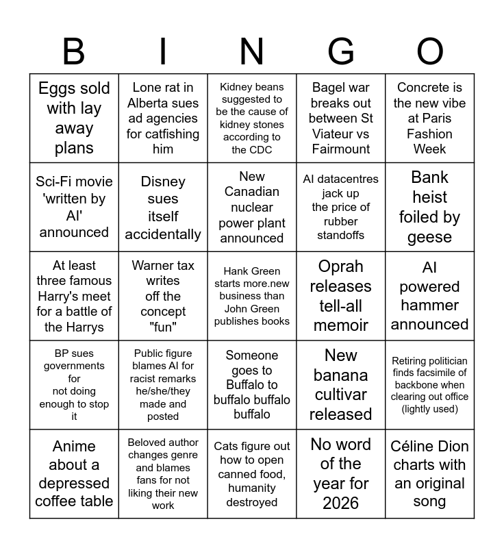 This bingo card has a free space and 24 words: Public figure blames AI for racist remarks he/she/they made and posted, Beloved author changes genre and blames fans for not liking their new work, New Canadian nuclear power plant announced, Anime about a depressed coffee table, Concrete is the new vibe at Paris Fashion Week, Eggs sold with lay away plans, Sci-Fi movie 'written by AI' announced, Lone rat in Alberta sues ad agencies for catfishing him, Oprah releases tell-all memoir, Someone goes to Buffalo to buffalo buffalo buffalo, AI datacentres jack up the price of rubber standoffs, At least three famous Harry's meet for a battle of the Harrys, New banana cultivar released, Retiring politician finds facsimile of backbone when clearing out office (lightly used), Disney sues itself accidentally, No word of the year for 2026, AI powered hammer announced, Kidney beans suggested to be the cause of kidney stones according to the CDC, Bank heist foiled by geese, Warner tax writes off the concept "fun", Céline Dion charts with an original song, BP sues governments for not doing enough to stop it, Bagel war breaks out between St Viateur vs Fairmount and Cats figure out how to open canned food, humanity destroyed.