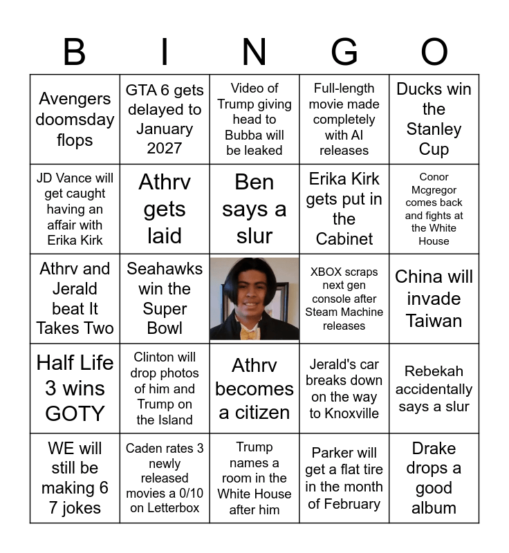 This bingo card has a free space and 24 words: Clinton will drop photos of him and Trump on the Island, Caden rates 3 newly released movies a 0/10 on Letterbox, Ben says a slur, WE will still be making 6 7 jokes, Ducks win the Stanley Cup, Avengers doomsday flops, JD Vance will get caught having an affair with Erika Kirk, GTA 6 gets delayed to January 2027, XBOX scraps next gen console after Steam Machine releases, Athrv becomes a citizen, Erika Kirk gets put in the Cabinet, Athrv and Jerald beat It Takes Two, Jerald's car breaks down on the way to Knoxville, Rebekah accidentally says a slur, Athrv gets laid, Parker will get a flat tire in the month of February, China will invade Taiwan, Video of Trump giving head to Bubba will be leaked, Conor Mcgregor comes back and fights at the White House, Seahawks win the Super Bowl, Drake drops a good album, Half Life 3 wins GOTY, Full-length movie made completely with AI releases and Trump names a room in the White House after him.