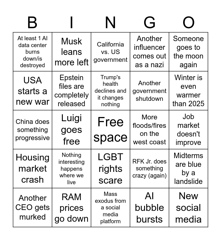 This bingo card has a free space and 24 words: Nothing interesting happens where we live, RAM prices go down, Trump's health declines and it changes nothing, Another CEO gets murked, Someone goes to the moon again, At least 1 AI data center burns down/is destroyed, USA starts a new war, Musk leans more left, More floods/fires on the west coast, LGBT rights scare, Another government shutdown, China does something progressive, RFK Jr. does something crazy (again), Midterms are blue by a landslide, Epstein files are completely released, AI bubble bursts, Job market doesn't improve, California vs. US government, Winter is even warmer than 2025, Luigi goes free, New social media, Housing market crash, Another influencer comes out as a nazi and Mass exodus from a social media platform.