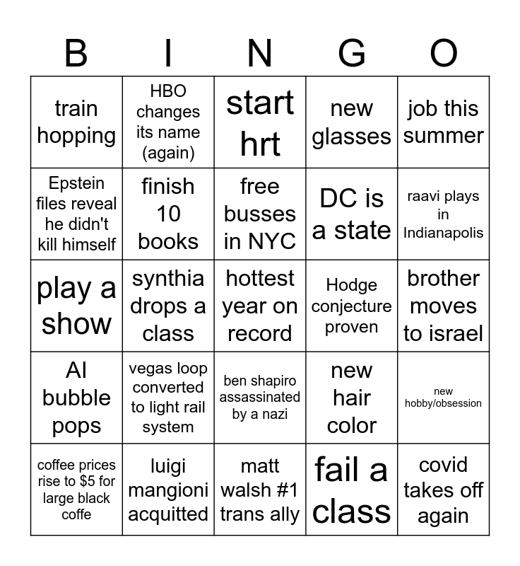 This bingo card has a free space and 24 words: vegas loop converted to light rail system, luigi mangioni acquitted, free busses in NYC, coffee prices rise to $5 for large black coffe, job this summer, train hopping, Epstein files reveal he didn't kill himself, HBO changes its name (again), Hodge conjecture proven, ben shapiro assassinated by a nazi, DC is a state, play a show, new hair color, new hobby/obsession, finish 10 books, fail a class, brother moves to israel, start hrt, raavi plays in Indianapolis, synthia drops a class, covid takes off again, AI bubble pops, new glasses and matt walsh #1 trans ally.