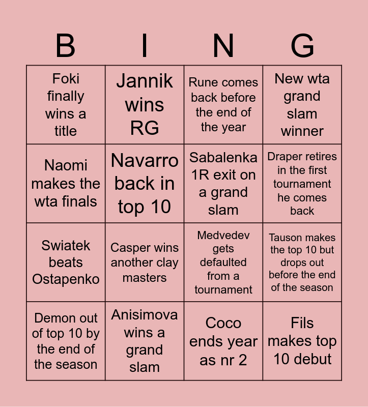 This bingo card has 16 words: Anisimova wins a grand slam, Tauson makes the top 10 but drops out before the end of the season, Rune comes back before the end of the year, Foki finally wins a title, Swiatek beats Ostapenko, Jannik wins RG, Medvedev gets defaulted from a tournament, Coco ends year as nr 2, Naomi makes the wta finals, Navarro back in top 10, Demon out of top 10 by the end of the season, New wta grand slam winner, Casper wins another clay masters, Draper retires in the first tournament he comes back, Sabalenka 1R exit on a grand slam and Fils makes top 10 debut.
