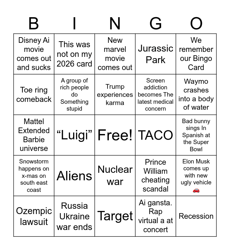 This bingo card has a free space and 24 words: Aliens, Russia Ukraine war ends, Trump experiences karma, Ozempic lawsuit, We remember our Bingo Card, Disney Ai movie comes out and sucks, Toe ring comeback, This was not on my 2026 card, TACO, Nuclear war, Screen addiction becomes The latest medical concern, Mattel Extended Barbie universe, Prince William cheating scandal, Elon Musk comes up with new ugly vehicle 🚗, A group of rich people do Something stupid, Ai gansta. Rap virtual a at concert, Bad bunny sings In Spanish at the Super Bowl, New marvel movie comes out, Waymo crashes into a body of water, “Luigi”, Recession, Snowstorm happens on x-mas on south east coast, Jurassic Park and Target.