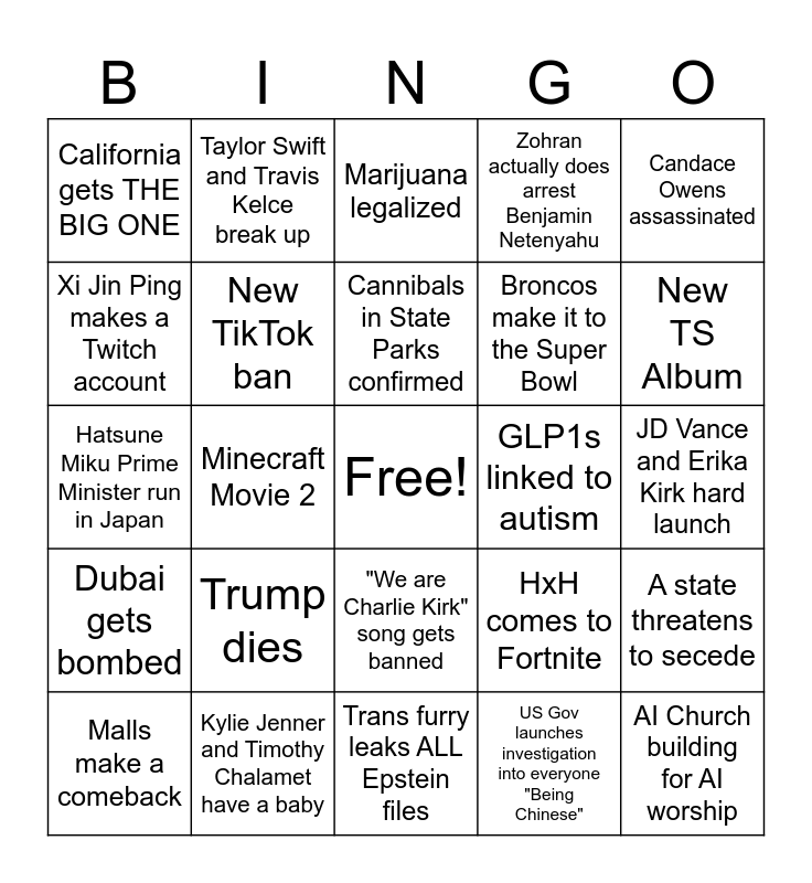 This bingo card has a free space and 24 words: Trump dies, Kylie Jenner and Timothy Chalamet have a baby, Cannibals in State Parks confirmed, Malls make a comeback, Candace Owens assassinated, California gets THE BIG ONE, Xi Jin Ping makes a Twitch account, Taylor Swift and Travis Kelce break up, GLP1s linked to autism, "We are Charlie Kirk" song gets banned, Broncos make it to the Super Bowl, Hatsune Miku Prime Minister run in Japan, HxH comes to Fortnite, A state threatens to secede, New TikTok ban, US Gov launches investigation into everyone "Being Chinese", JD Vance and Erika Kirk hard launch, Marijuana legalized, New TS Album, Minecraft Movie 2, AI Church building for AI worship, Dubai gets bombed, Zohran actually does arrest Benjamin Netenyahu and Trans furry leaks ALL Epstein files.