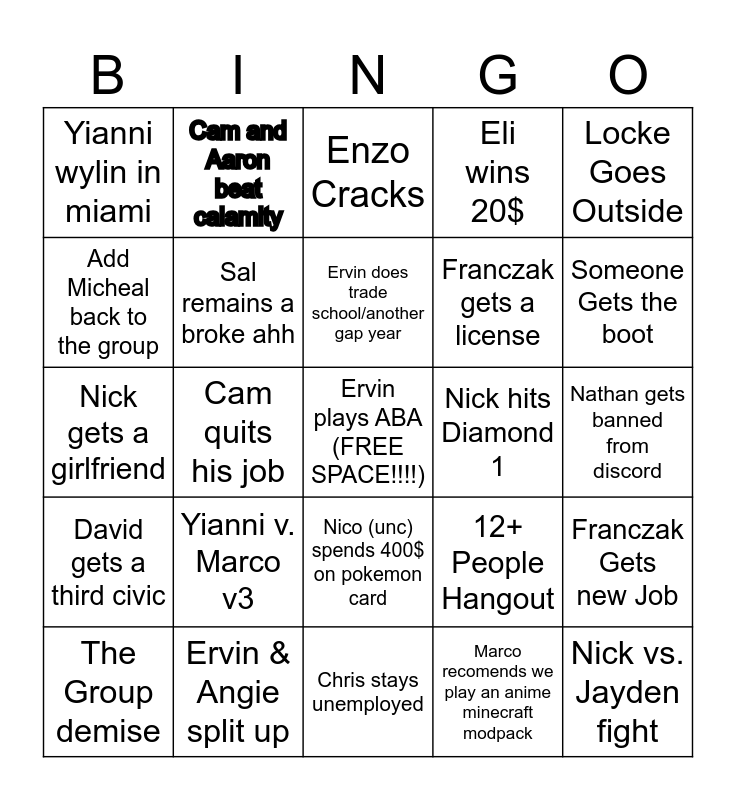 This bingo card has a free space and 24 words: Yianni v. Marco v3, Ervin & Angie split up, Ervin does trade school/another gap year, The Group demise, Locke Goes Outside, Yianni wylin in miami, Add Micheal back to the group, Cam and Aaron beat calamity, Nick hits Diamond 1, Nico (unc) spends 400$ on pokemon card, Franczak gets a license, Nick gets a girlfriend, 12+ People Hangout, Franczak Gets new Job, Sal remains a broke ahh, Marco recomends we play an anime minecraft modpack, Nathan gets banned from discord, Enzo Cracks, Someone Gets the boot, Cam quits his job, Nick vs. Jayden fight, David gets a third civic, Eli wins 20$ and Chris stays unemployed.
