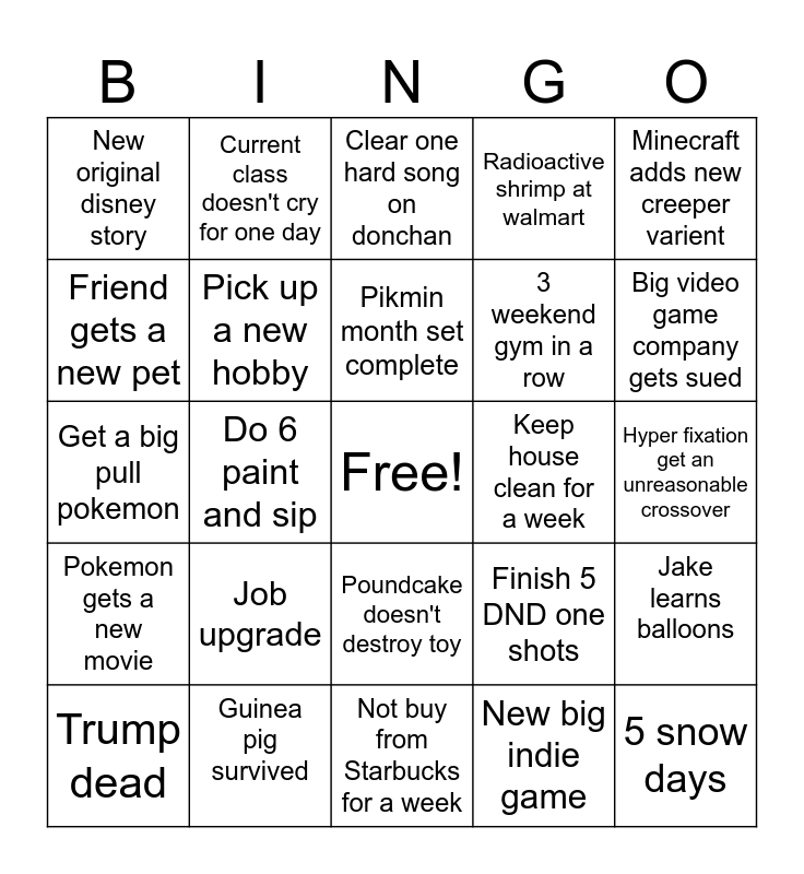 This bingo card has a free space and 24 words: Job upgrade, Guinea pig survived, Pikmin month set complete, Trump dead, Minecraft adds new creeper varient, New original disney story, Friend gets a new pet, Current class doesn't cry for one day, Keep house clean for a week, Poundcake doesn't destroy toy, 3 weekend gym in a row, Get a big pull pokemon, Finish 5 DND one shots, Jake learns balloons, Pick up a new hobby, New big indie game, Hyper fixation get an unreasonable crossover, Clear one hard song on donchan, Big video game company gets sued, Do 6 paint and sip, 5 snow days, Pokemon gets a new movie, Radioactive shrimp at walmart and Not buy from Starbucks for a week.