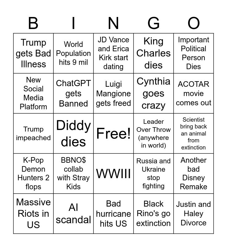 This bingo card has a free space and 24 words: BBNO$ collab with Stray Kids, AI scandal, Luigi Mangione gets freed, Massive Riots in US, Important Political Person Dies, Trump gets Bad Illness, New Social Media Platform, World Population hits 9 mil, Leader Over Throw (anywhere in world), WWIII, Cynthia goes crazy, Trump impeached, Russia and Ukraine stop fighting, Another bad Disney Remake, ChatGPT gets Banned, Black Rino's go extinction, Scientist bring back an animal from extinction, JD Vance and Erica Kirk start dating, ACOTAR movie comes out, Diddy dies, Justin and Haley Divorce, K-Pop Demon Hunters 2 flops, King Charles dies and Bad hurricane hits US.