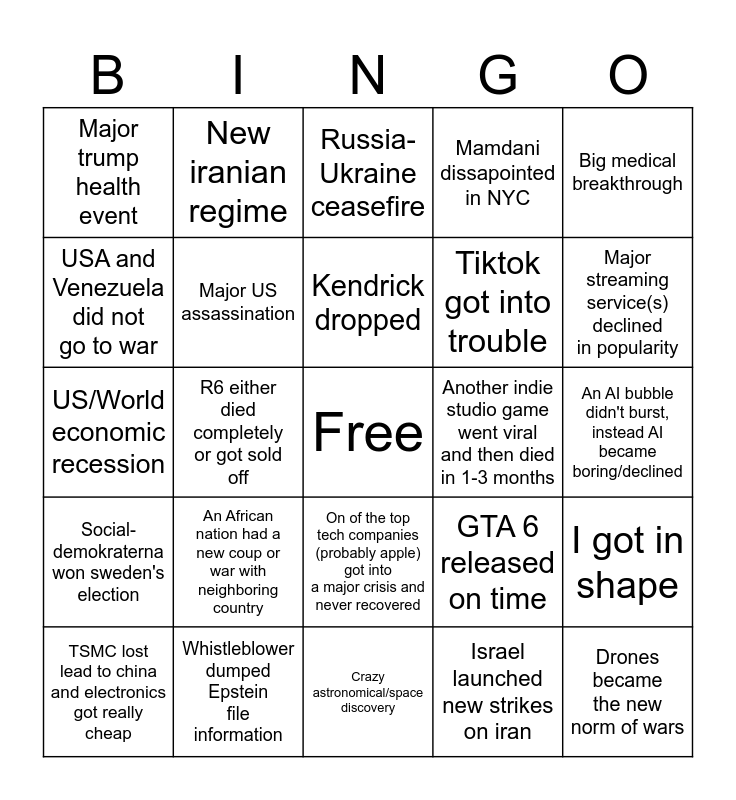This bingo card has a free space and 24 words: An African nation had a new coup or war with neighboring country, Whistleblower dumped Epstein file information, Kendrick dropped, TSMC lost lead to china and electronics got really cheap, Big medical breakthrough, Major trump health event, USA and Venezuela did not go to war, New iranian regime, Another indie studio game went viral and then died in 1-3 months, On of the top tech companies (probably apple) got into a major crisis and never recovered, Tiktok got into trouble, US/World economic recession, GTA 6 released on time, I got in shape, Major US assassination, Israel launched new strikes on iran, An AI bubble didn't burst, instead AI became boring/declined, Russia-Ukraine ceasefire, Major streaming service(s) declined in popularity, R6 either died completely or got sold off, Drones became the new norm of wars, Social- demokraterna won sweden's election, Mamdani dissapointed in NYC and Crazy astronomical/space discovery.