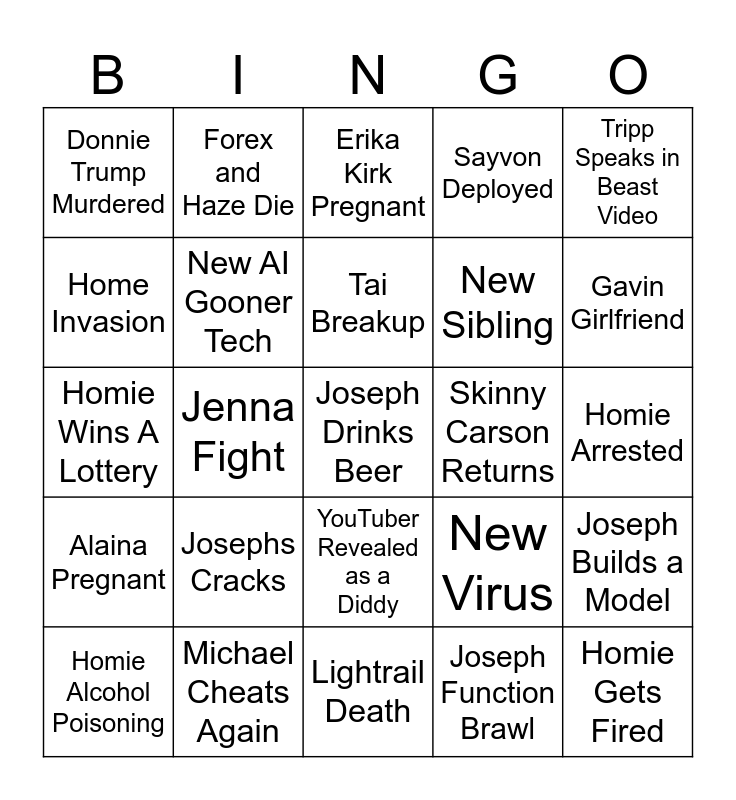 This bingo card has a free space and 24 words: Josephs Cracks, Michael Cheats Again, Tai Breakup, Homie Alcohol Poisoning, Tripp Speaks in Beast Video, Donnie Trump Murdered, Home Invasion, Forex and Haze Die, Skinny Carson Returns, YouTuber Revealed as a Diddy, New Sibling, Homie Wins A Lottery, New Virus, Joseph Builds a Model, New AI Gooner Tech, Joseph Function Brawl, Homie Arrested, Erika Kirk Pregnant, Gavin Girlfriend, Jenna Fight, Homie Gets Fired, Alaina Pregnant, Sayvon Deployed and Lightrail Death.