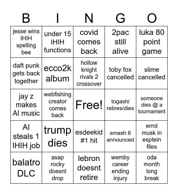 This bingo card has a free space and 24 words: trump dies, asap rocky doesnt drop, hollow knight rivals 2 crossover, balatro DLC, luka 80 point game, jesse wins IHIH spelling bee, daft punk gets back together, under 15 IHIH functions, togashi retires/dies, esdeekid #1 hit, toby fox cancelled, jay z makes AI music, smash 6 announced, errol musk in esptein files, ecco2k album, wemby career ending injury, someone dies @ a tournament, covid comes back, slime cancelled, webfishing creator comes back, oda month long break, AI steals 1 IHIH job, 2pac still alive and lebron doesnt retire.