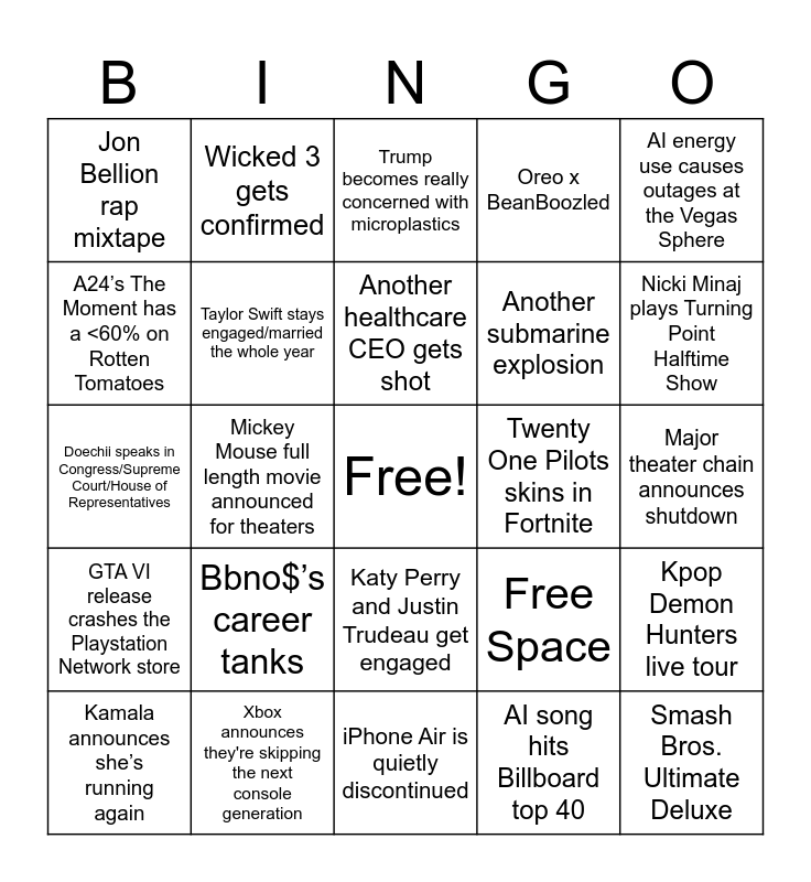 This bingo card has a free space and 25 words: Bbno$’s career tanks, iPhone Air is quietly discontinued, Another healthcare CEO gets shot, Kamala announces she’s running again, AI energy use causes outages at the Vegas Sphere, Jon Bellion rap mixtape, A24’s The Moment has a <60% on Rotten Tomatoes, Wicked 3 gets confirmed, Twenty One Pilots skins in Fortnite, Katy Perry and Justin Trudeau get engaged, Another submarine explosion, Doechii speaks in Congress/Supreme Court/House of Representatives, Free Space, Kpop Demon Hunters live tour, Taylor Swift stays engaged/married the whole year, New Harry Styles album, Major theater chain announces shutdown, Trump becomes really concerned with microplastics, Nicki Minaj plays Turning Point Halftime Show, Mickey Mouse full length movie announced for theaters, Smash Bros. Ultimate Deluxe, Xbox announces they're skipping the next console generation, GTA VI release crashes the Playstation Network store, Oreo x BeanBoozled and AI song hits Billboard top 40.