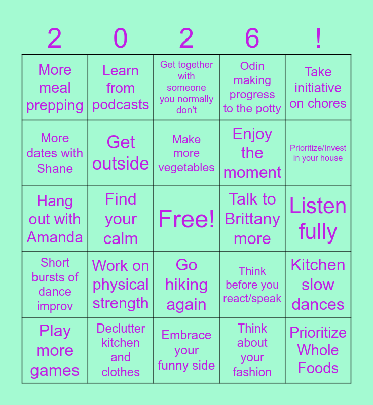 This bingo card has a free space and 24 words: Work on physical strength, Declutter kitchen and clothes, Make more vegetables, Play more games, Take initiative on chores, More meal prepping, More dates with Shane, Learn from podcasts, Talk to Brittany more, Go hiking again, Enjoy the moment, Hang out with Amanda, Think before you react/speak, Kitchen slow dances, Get outside, Think about your fashion, Listen fully, Get together with someone you normally don't, Prioritize/Invest in your house, Find your calm, Prioritize Whole Foods, Short bursts of dance improv, Odin making progress to the potty and Embrace your funny side.