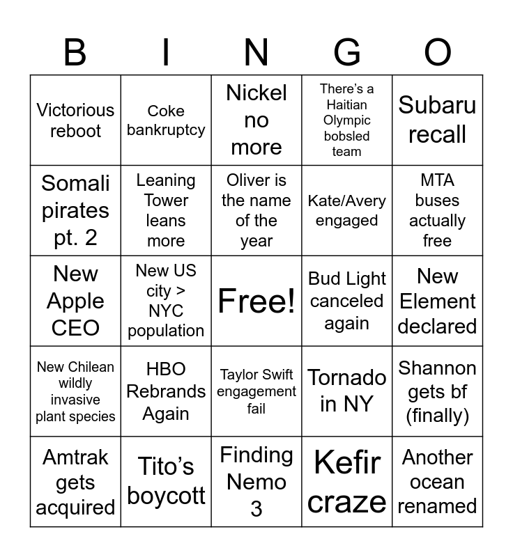 This bingo card has a free space and 24 words: HBO Rebrands Again, Tito’s boycott, Oliver is the name of the year, Amtrak gets acquired, Subaru recall, Victorious reboot, Somali pirates pt. 2, Coke bankruptcy, Bud Light canceled again, Taylor Swift engagement fail, Kate/Avery engaged, New Apple CEO, Tornado in NY, Shannon gets bf (finally), Leaning Tower leans more, Kefir craze, New Element declared, Nickel no more, MTA buses actually free, New US city > NYC population, Another ocean renamed, New Chilean wildly invasive plant species, There’s a Haitian Olympic bobsled team and Finding Nemo 3.