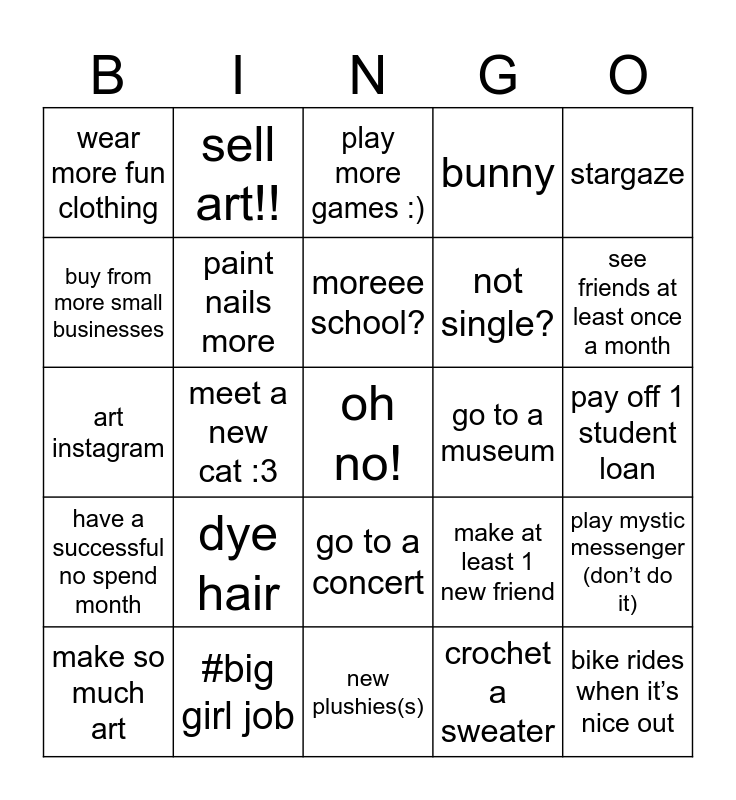 This bingo card has a free space and 24 words: dye hair, #big girl job, moreee school?, make so much art, stargaze, wear more fun clothing, buy from more small businesses, sell art!!, go to a museum, go to a concert, not single?, art instagram, make at least 1 new friend, play mystic messenger (don’t do it), paint nails more, crochet a sweater, pay off 1 student loan, play more games :), see friends at least once a month, meet a new cat :3, bike rides when it’s nice out, have a successful no spend month, bunny and new plushies(s).