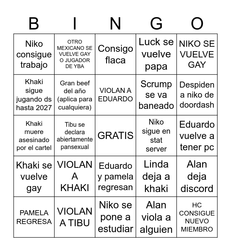 This bingo card has a free space and 24 words: VIOLAN A KHAKI, VIOLAN A TIBU, VIOLAN A EDUARDO, PAMELA REGRESA, NIKO SE VUELVE GAY, Niko consigue trabajo, Khaki sigue jugando ds hasta 2027, OTRO MEXICANO SE VUELVE GAY O JUGADOR DE YBA, Niko sigue en stat server, Eduardo y pamela regresan, Scrump se va baneado, Khaki muere asesinado por el cartel, Linda deja a khaki, Alan deja discord, Gran beef del año (aplica para cualquiera), Alan viola a alguien, Eduardo vuelve a tener pc, Consigo flaca, Despiden a niko de doordash, Tibu se declara abiertamente pansexual, HC CONSIGUE NUEVO MIEMBRO, Khaki se vuelve gay, Luck se vuelve papa and Niko se pone a estudiar.