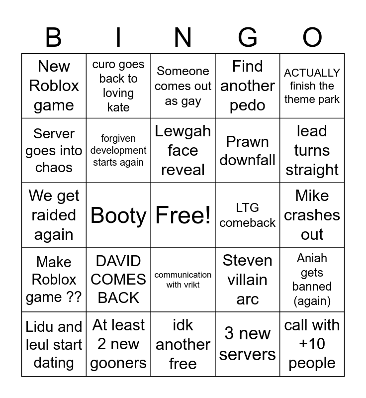 This bingo card has a free space and 24 words: DAVID COMES BACK, At least 2 new gooners, Lewgah face reveal, Lidu and leul start dating, ACTUALLY finish the theme park, New Roblox game, Server goes into chaos, curo goes back to loving kate, LTG comeback, communication with vrikt, Prawn downfall, We get raided again, Steven villain arc, Aniah gets banned (again), forgiven development starts again, 3 new servers, Mike crashes out, Someone comes out as gay, lead turns straight, Booty, call with +10 people, Make Roblox game ??, Find another pedo and idk another free.