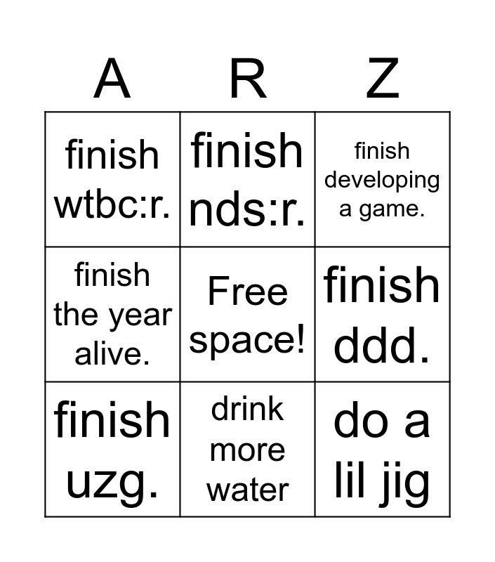 This bingo card has a free space and 8 words: finish ddd., finish developing a game., finish nds:r., finish uzg., finish wtbc:r., do a lil jig, finish the year alive. and drink more water.