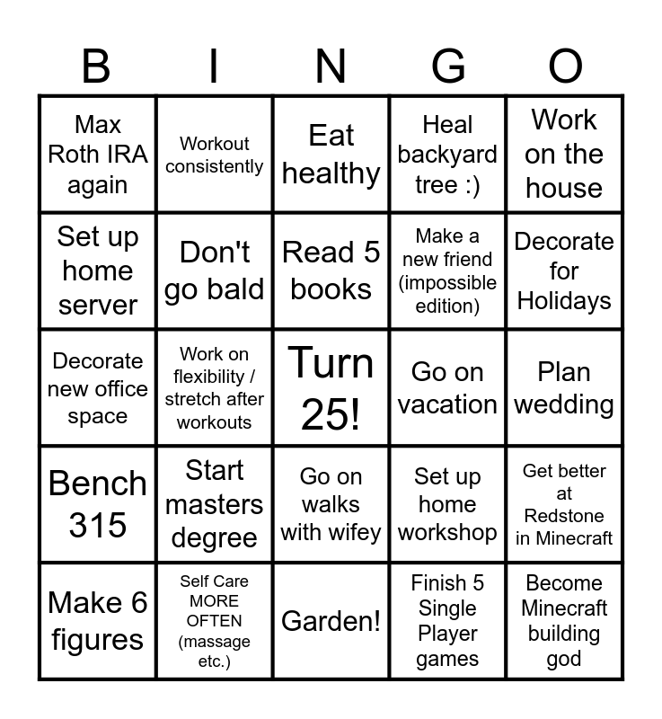 This bingo card has a free space and 24 words: Make 6 figures, Start masters degree, Read 5 books, Finish 5 Single Player games, Work on the house, Max Roth IRA again, Workout consistently, Eat healthy, Go on vacation, Plan wedding, Decorate new office space, Don't go bald, Set up home workshop, Get better at Redstone in Minecraft, Set up home server, Self Care MORE OFTEN (massage etc.), Garden!, Heal backyard tree :), Decorate for Holidays, Bench 315, Work on flexibility / stretch after workouts, Go on walks with wifey, Make a new friend (impossible edition) and Become Minecraft building god.