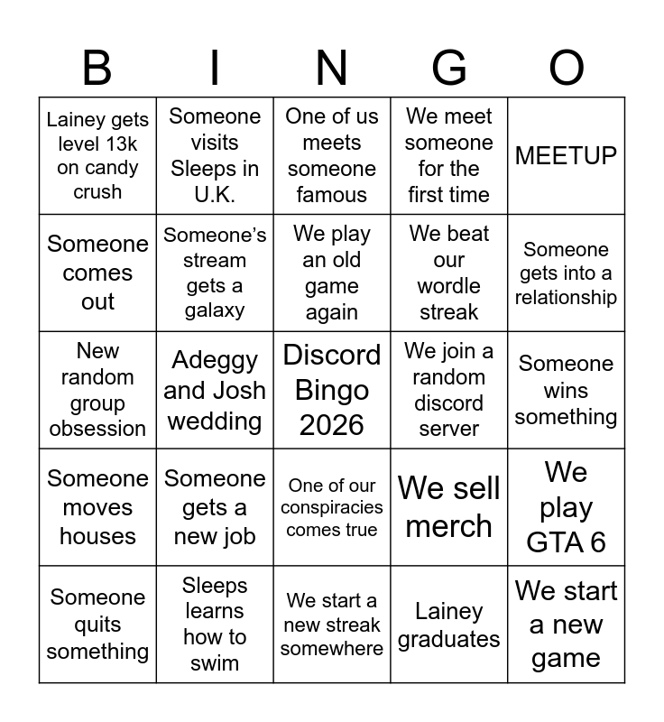 This bingo card has a free space and 24 words: Someone gets a new job, Sleeps learns how to swim, We play an old game again, Someone quits something, MEETUP, Lainey gets level 13k on candy crush, Someone comes out, Someone visits Sleeps in U.K., We join a random discord server, One of our conspiracies comes true, We beat our wordle streak, New random group obsession, We sell merch, We play GTA 6, Someone’s stream gets a galaxy, Lainey graduates, Someone wins something, One of us meets someone famous, Someone gets into a relationship, Adeggy and Josh wedding, We start a new game, Someone moves houses, We meet someone for the first time and We start a new streak somewhere.
