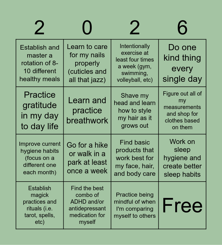 This bingo card has 16 words: Find the best combo of ADHD and/or antidepressant medication for myself, Work on sleep hygiene and create better sleep habits, Intentionally exercise at least four times a week (gym, swimming, volleyball, etc), Establish and master a rotation of 8-10 different healthy meals, Improve current hygiene habits (focus on a different one each month), Learn to care for my nails properly (cuticles and all that jazz), Find basic products that work best for my face, hair, and body care, Practice being mindful of when I'm comparing myself to others, Practice gratitude in my day to day life, Learn and practice breathwork, Establish magick practices and rituals (i.e. tarot, spells, etc), Do one kind thing every single day, Go for a hike or walk in a park at least once a week, Figure out all of my measurements and shop for clothes based on them, Shave my head and learn how to style my hair as it grows out and Free.
