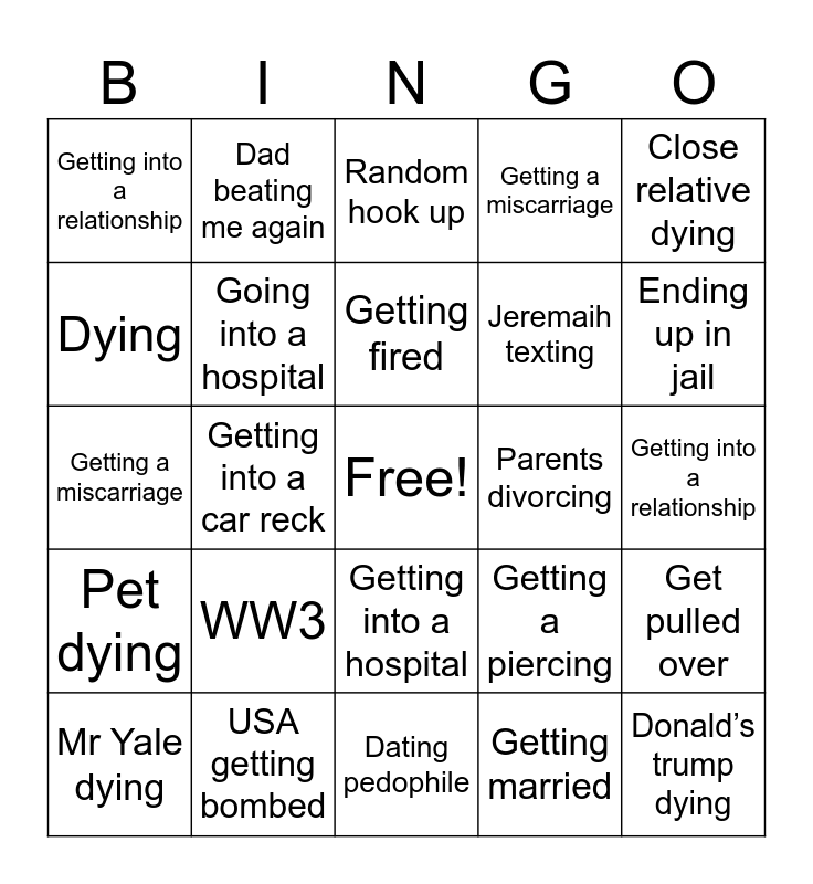 This bingo card has a free space and 24 words: Mr Yale dying, WW3, Getting fired, Getting married, Close relative dying, Getting into a relationship, Dad beating me again, Random hook up, Parents divorcing, Getting into a relationship, Getting a miscarriage, Going into a hospital, Getting a piercing, Get pulled over, Dying, USA getting bombed, Dating pedophile, Getting a miscarriage, Ending up in jail, Pet dying, Getting into a car reck, Getting into a hospital, Jeremaih texting and Donald’s trump dying.