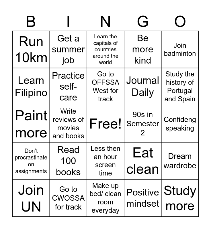 This bingo card has a free space and 24 words: Read 100 books, Go to CWOSSA for track, Go to OFFSSA West for track, Join UN, Join badminton, Run 10km, Learn Filipino, Get a summer job, 90s in Semester 2, Less then an hour screen time, Journal Daily, Paint more, Eat clean, Dream wardrobe, Practice self-care, Positive mindset, Confideng speaking, Learn the capitals of countries around the world, Study the history of Portugal and Spain, Write reviews of movies and books, Study more, Don’t procrastinate on assignments, Be more kind and Make up bed/ clean room everyday.