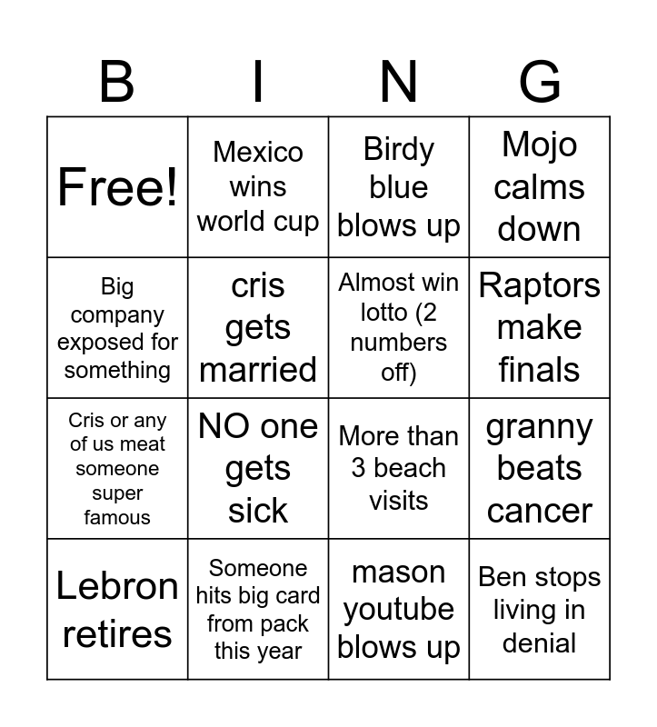This bingo card has 16 words: Lebron retires, Someone hits big card from pack this year, Birdy blue blows up, Mojo calms down, Big company exposed for something, Mexico wins world cup, More than 3 beach visits, granny beats cancer, Free!, cris gets married, mason youtube blows up, Raptors make finals, Cris or any of us meat someone super famous, NO one gets sick, Almost win lotto (2 numbers off) and Ben stops living in denial.