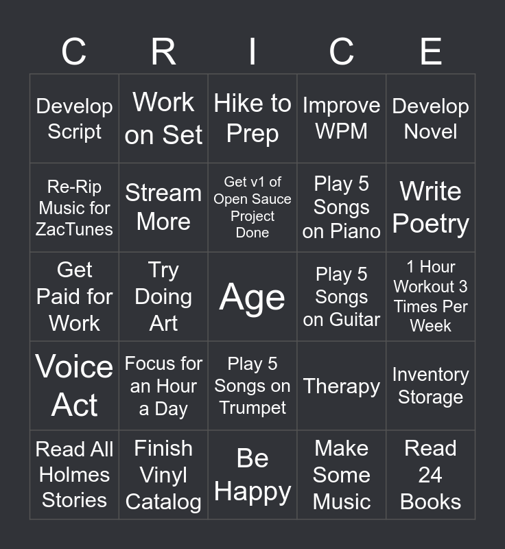 This bingo card has a free space and 24 words: Focus for an Hour a Day, Finish Vinyl Catalog, Get v1 of Open Sauce Project Done, Read All Holmes Stories, Develop Novel, Develop Script, Re-Rip Music for ZacTunes, Work on Set, Play 5 Songs on Guitar, Play 5 Songs on Trumpet, Play 5 Songs on Piano, Get Paid for Work, Therapy, Inventory Storage, Stream More, Make Some Music, 1 Hour Workout 3 Times Per Week, Hike to Prep, Write Poetry, Try Doing Art, Read 24 Books, Voice Act, Improve WPM and Be Happy.