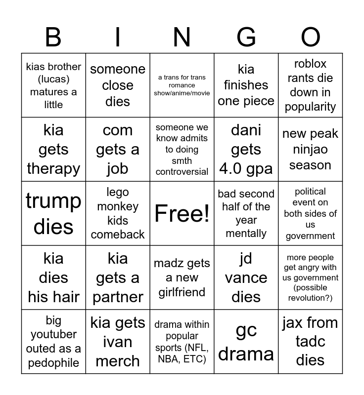This bingo card has a free space and 24 words: kia gets a partner, kia gets ivan merch, someone we know admits to doing smth controversial, big youtuber outed as a pedophile, roblox rants die down in popularity, kias brother (lucas) matures a little, kia gets therapy, someone close dies, bad second half of the year mentally, madz gets a new girlfriend, dani gets 4.0 gpa, trump dies, jd vance dies, more people get angry with us government (possible revolution?), com gets a job, gc drama, political event on both sides of us government, a trans for trans romance show/anime/movie, new peak ninjao season, lego monkey kids comeback, jax from tadc dies, kia dies his hair, kia finishes one piece and drama within popular sports (NFL, NBA, ETC).