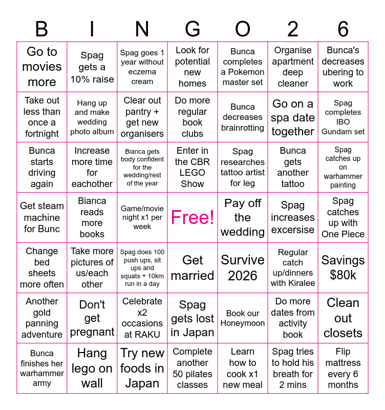 This bingo card has a free space and 48 words: Book our Honeymoon, Go on a spa date together, Complete another 50 pilates classes, Bianca reads more books, Bianca gets body confident for the wedding/rest of the year, Spag catches up with One Piece, Spag gets a 10% raise, Hang lego on wall, Organise apartment deep cleaner, Get married, Bunca's decreases ubering to work, Look for potential new homes, Bunca gets another tattoo, Spag researches tattoo artist for leg, Another gold panning adventure, Spag increases excersise, Take out less than once a fortnight, Spag completes IBO Gundam set, Do more dates from activity book, Bunca completes a Pokemon master set, Bunca decreases brainrotting, Game/movie night x1 per week, Go to movies more, Hang up and make wedding photo album, Clean out closets, Clear out pantry + get new organisers, Spag catches up on warhammer painting, Bunca finishes her warhammer army, Enter in the CBR LEGO Show, Increase more time for eachother, Spag tries to hold his breath for 2 mins, Pay off the wedding, Savings $80k, Don't get pregnant, Get steam machine for Bunc, Survive 2026, Regular catch up/dinners with Kiralee, Bunca starts driving again, Spag does 100 push ups, sit ups and squats + 10km run in a day, Celebrate x2 occasions at RAKU, Change bed sheets more often, Flip mattress every 6 months, Spag goes 1 year without eczema cream, Try new foods in Japan, Do more regular book clubs, Spag gets lost in Japan, Take more pictures of us/each other and Learn how to cook x1 new meal.