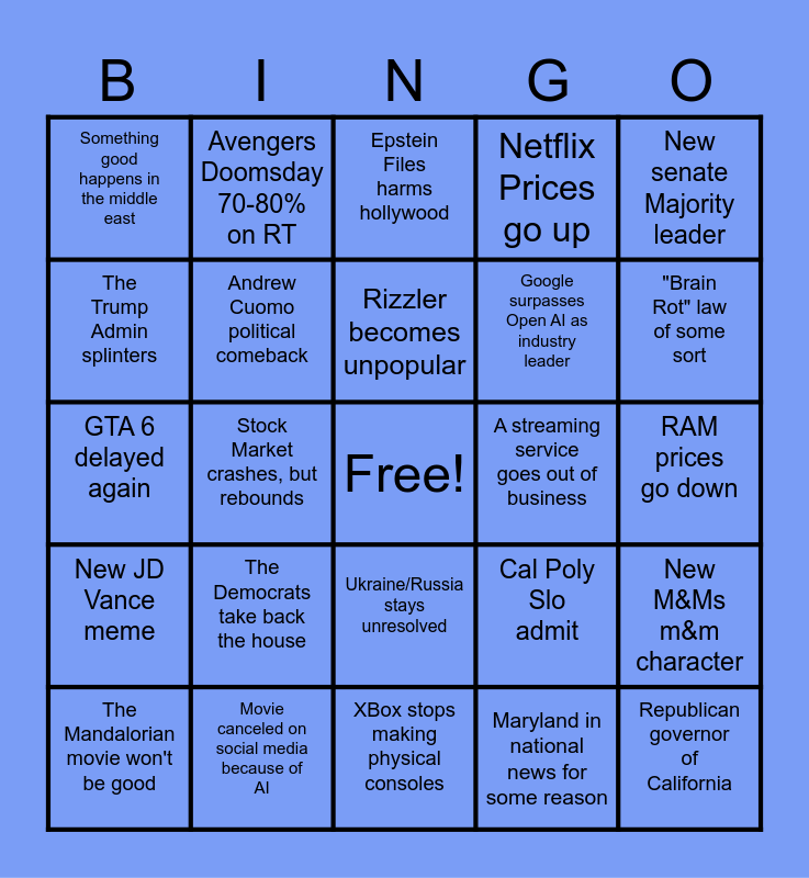 This bingo card has a free space and 29 words: The Mandalorian movie won't be good, I get a new job, Stock Market crashes, but rebounds, Greenland becomes hotly contested, Something good happens in the middle east, Epstein Files harms hollywood, Andrew Cuomo political comeback, The Democrats take back the house, A streaming service goes out of business, Movie canceled on social media because of AI, RAM prices go down, Republican governor of California, XBox stops making physical consoles, Maryland in national news for some reason, "Brain Rot" law of some sort, Jorts make a come back, Ukraine/Russia stays unresolved, New JD Vance meme, New senate Majority leader, GTA 6 delayed again, Cal Poly Slo admit, Kellogs does something stupid, Google surpasses Open AI as industry leader, The Trump Admin splinters, Netflix Prices go up, Avengers Doomsday 70-80% on RT, New M&Ms m&m character, Rizzler becomes unpopular and Red Dye 40 products become commodified.