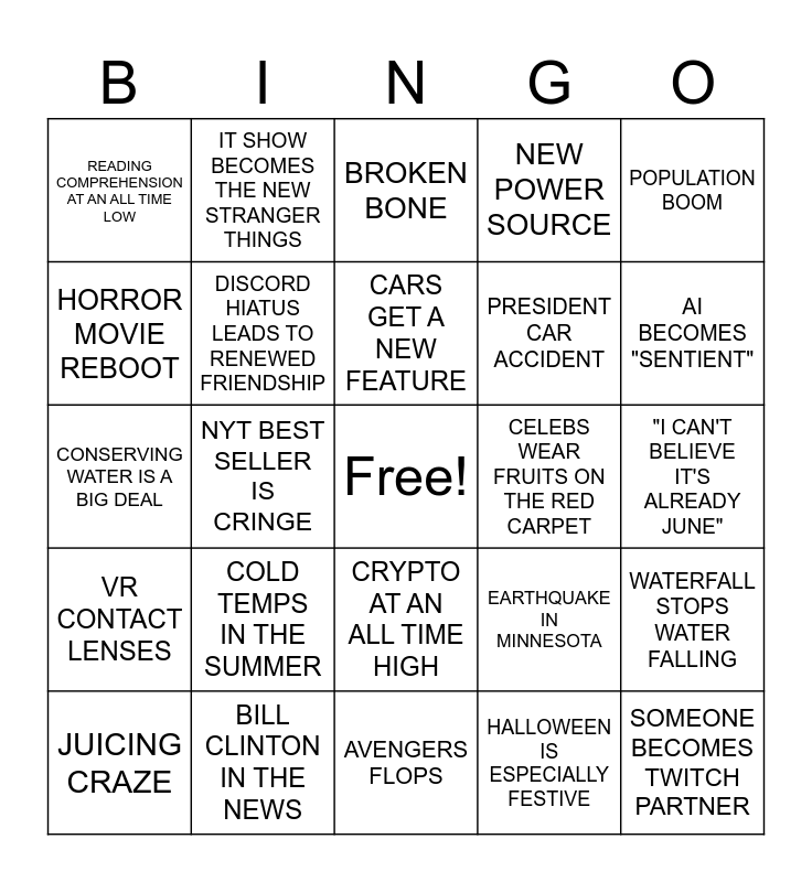 This bingo card has a free space and 24 words: COLD TEMPS IN THE SUMMER, BILL CLINTON IN THE NEWS, CARS GET A NEW FEATURE, JUICING CRAZE, POPULATION BOOM, READING COMPREHENSION AT AN ALL TIME LOW, HORROR MOVIE REBOOT, IT SHOW BECOMES THE NEW STRANGER THINGS, CELEBS WEAR FRUITS ON THE RED CARPET, CRYPTO AT AN ALL TIME HIGH, PRESIDENT CAR ACCIDENT, CONSERVING WATER IS A BIG DEAL, EARTHQUAKE IN MINNESOTA, WATERFALL STOPS WATER FALLING, DISCORD HIATUS LEADS TO RENEWED FRIENDSHIP, HALLOWEEN IS ESPECIALLY FESTIVE, "I CAN'T BELIEVE IT'S ALREADY JUNE", BROKEN BONE, AI BECOMES "SENTIENT", NYT BEST SELLER IS CRINGE, SOMEONE BECOMES TWITCH PARTNER, VR CONTACT LENSES, NEW POWER SOURCE and AVENGERS FLOPS.
