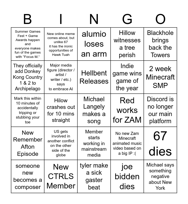 This bingo card has a free space and 24 words: US gets involved in another conflict on the other side of the globe, New CTRLS Member, Hellbent Releases, someone new becomes a composer, Blackhole brings back the Towers, Summer Games Fest + Game Awards happen and everyone makes fun of the games with “Focus M.”, They officially add Donkey Kong Country 1 & 2 to Archipelago, New online meme comes about, but unlike 67 it has the ironic opportunities of Hawk Tuah, Red works for ZAM, Member starts working in mainstream media, Indie game wins game of the year, Mark this within 10 minutes of accidentally tripping or stubbing your toe, No new Zam Minecraft animated music video based on a big IP :(, 67 dies, Major media figure (director / artist / writer / etc.) says to embrace AI, joe bidden dies, Discord is no longer our main platform, alumio loses an arm, 2 week Minecraft SMP, Hilow crashes out for 10 mins straight, Michael says something negative about New York, New Remember Afton Episode, Hillow witnesses a tree perish and tyler make a sick gaster beat.