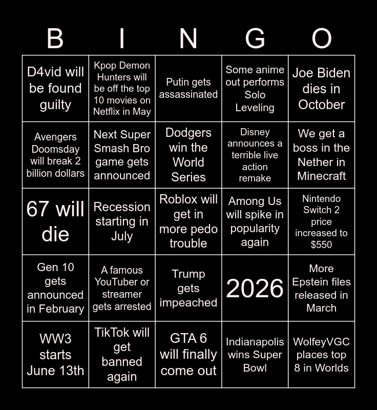 This bingo card has 25 words: A famous YouTuber or streamer gets arrested, GTA 6 will finally come out, Dodgers win the World Series, WW3 starts June 13th, Joe Biden dies in October, D4vid will be found guilty, Avengers Doomsday will break 2 billion dollars, Kpop Demon Hunters will be off the top 10 movies on Netflix in May, Among Us will spike in popularity again, Trump gets impeached, Disney announces a terrible live action remake, 67 will die, 2026, More Epstein files released in March, Next Super Smash Bro game gets announced, WolfeyVGC places top 8 in Worlds, Nintendo Switch 2 price increased to $550, Putin gets assassinated, We get a boss in the Nether in Minecraft, Recession starting in July, Roblox will get in more pedo trouble, TikTok will get banned again, Gen 10 gets announced in February, Some anime out performs Solo Leveling and Indianapolis wins Super Bowl.