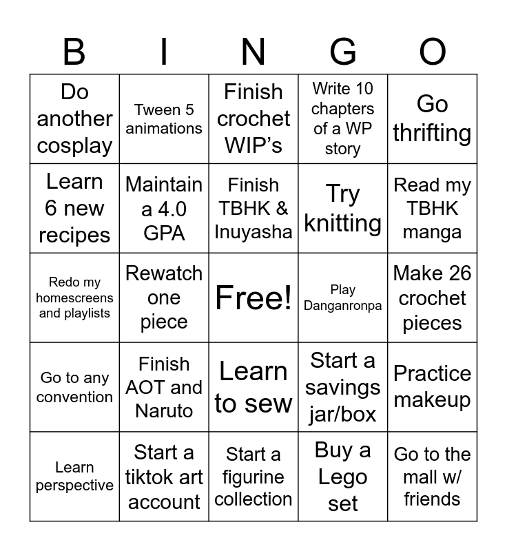 This bingo card has a free space and 24 words: Finish AOT and Naruto, Start a tiktok art account, Finish TBHK & Inuyasha, Learn perspective, Go thrifting, Do another cosplay, Learn 6 new recipes, Tween 5 animations, Play Danganronpa, Learn to sew, Try knitting, Redo my homescreens and playlists, Start a savings jar/box, Practice makeup, Maintain a 4.0 GPA, Buy a Lego set, Make 26 crochet pieces, Finish crochet WIP’s, Read my TBHK manga, Rewatch one piece, Go to the mall w/ friends, Go to any convention, Write 10 chapters of a WP story and Start a figurine collection.