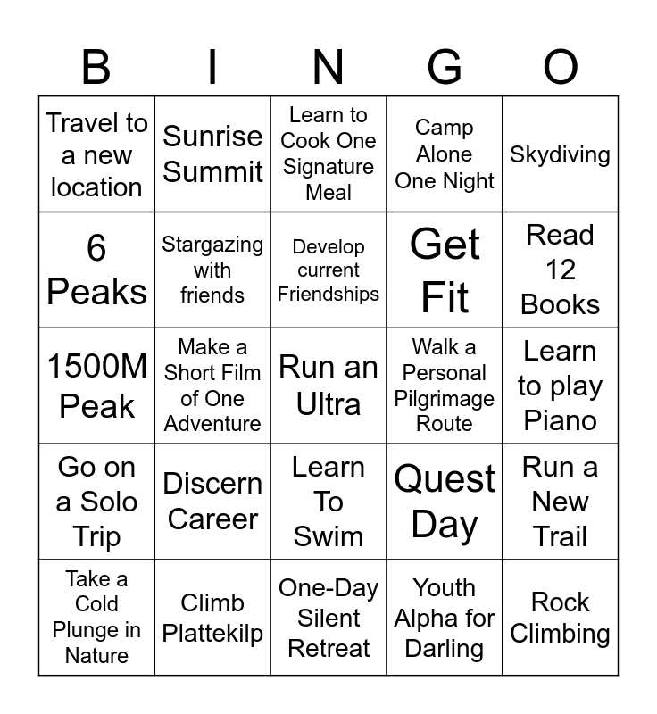 This bingo card has 25 words: Discern Career, One-Day Silent Retreat, Develop current Friendships, Take a Cold Plunge in Nature, Skydiving, Travel to a new location, 6 Peaks, Sunrise Summit, Walk a Personal Pilgrimage Route, Learn To Swim, Get Fit, 1500M Peak, Quest Day, Run a New Trail, Stargazing with friends, Rock Climbing, Learn to play Piano, Learn to Cook One Signature Meal, Read 12 Books, Make a Short Film of One Adventure, Run an Ultra, Climb Plattekilp, Go on a Solo Trip, Camp Alone One Night and Youth Alpha for Darling.