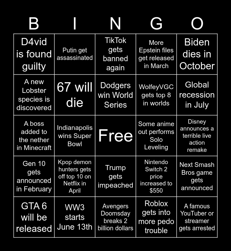 This bingo card has a free space and 24 words: Kpop demon hunters gets off top 10 on Netflix in April, WW3 starts June 13th, Dodgers win World Series, GTA 6 will be released, Biden dies in October, D4vid is found guilty, A new Lobster species is discovered, Putin get assassinated, Some anime out performs Solo Leveling, Trump gets impeached, WolfeyVGC gets top 8 in worlds, A boss added to the nether in Minecraft, Nintendo Switch 2 price increased to $550, Next Smash Bros game gets announced, 67 will die, Roblox gets into more pedo trouble, Disney announces a terrible live action remake, TikTok gets banned again, Global recession in July, Indianapolis wins Super Bowl, A famous YouTuber or streamer gets arrested, Gen 10 gets announced in February, More Epstein files get released in March and Avengers Doomsday breaks 2 billion dollars.