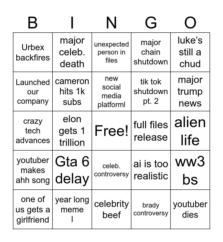 This bingo card has a free space and 24 words: Gta 6 delay, year long meme l, new social media platforml, one of us gets a girlfriend, luke’s still a chud, Urbex backfires, Launched our company, major celeb. death, full files release, celeb. controversy, tik tok shutdown pt. 2, crazy tech advances, ai is too realistic, ww3 bs, cameron hits 1k subs, brady controversy, alien life, unexpected person in files, major trump news, elon gets 1 trillion, youtuber dies, youtuber makes ahh song, major chain shutdown and celebrity beef.