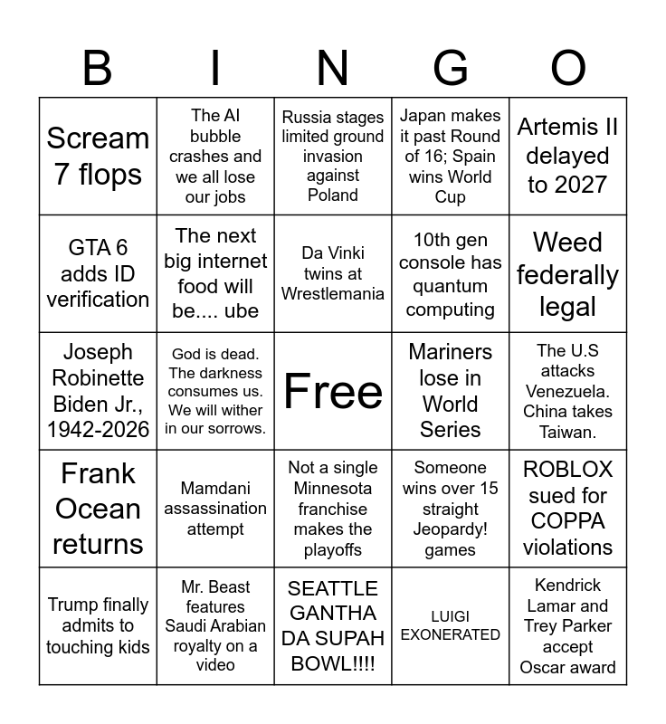 This bingo card has a free space and 24 words: Mamdani assassination attempt, Mr. Beast features Saudi Arabian royalty on a video, Da Vinki twins at Wrestlemania, Trump finally admits to touching kids, Artemis II delayed to 2027, Scream 7 flops, GTA 6 adds ID verification, The AI bubble crashes and we all lose our jobs, Mariners lose in World Series, Not a single Minnesota franchise makes the playoffs, 10th gen console has quantum computing, Joseph Robinette Biden Jr., 1942-2026, Someone wins over 15 straight Jeopardy! games, ROBLOX sued for COPPA violations, The next big internet food will be.... ube, LUIGI EXONERATED, The U.S attacks Venezuela. China takes Taiwan., Russia stages limited ground invasion against Poland, Weed federally legal, God is dead. The darkness consumes us. We will wither in our sorrows., Kendrick Lamar and Trey Parker accept Oscar award, Frank Ocean returns, Japan makes it past Round of 16; Spain wins World Cup and SEATTLE GANTHA DA SUPAH BOWL!!!!.