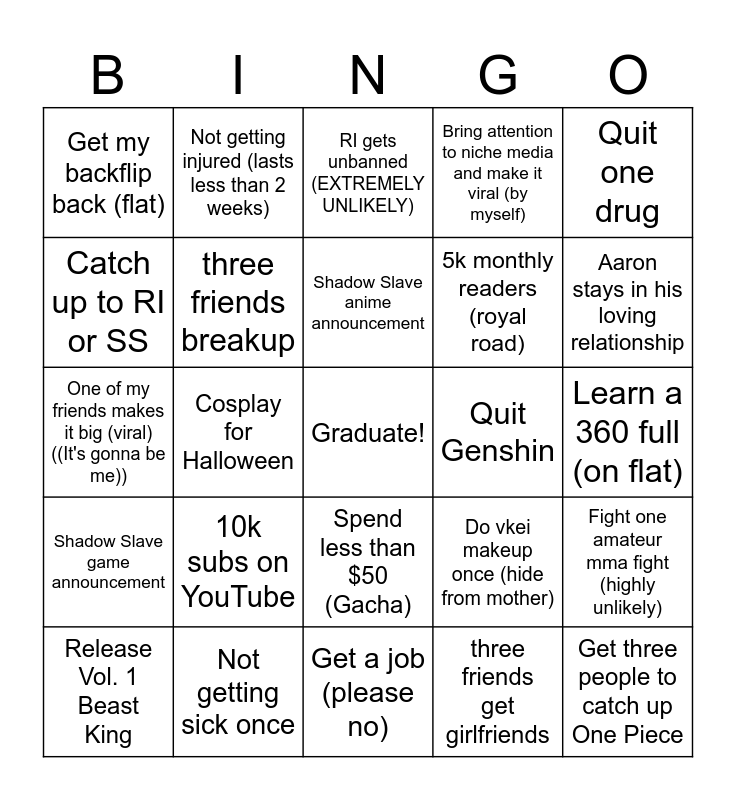 This bingo card has a free space and 24 words: 10k subs on YouTube, Not getting sick once, Shadow Slave anime announcement, Release Vol. 1 Beast King, Quit one drug, Get my backflip back (flat), Catch up to RI or SS, Not getting injured (lasts less than 2 weeks), Quit Genshin, Spend less than $50 (Gacha), 5k monthly readers (royal road), One of my friends makes it big (viral) ((It's gonna be me)), Do vkei makeup once (hide from mother), Fight one amateur mma fight (highly unlikely), three friends breakup, three friends get girlfriends, Learn a 360 full (on flat), RI gets unbanned (EXTREMELY UNLIKELY), Aaron stays in his loving relationship, Cosplay for Halloween, Get three people to catch up One Piece, Shadow Slave game announcement, Bring attention to niche media and make it viral (by myself) and Get a job (please no).