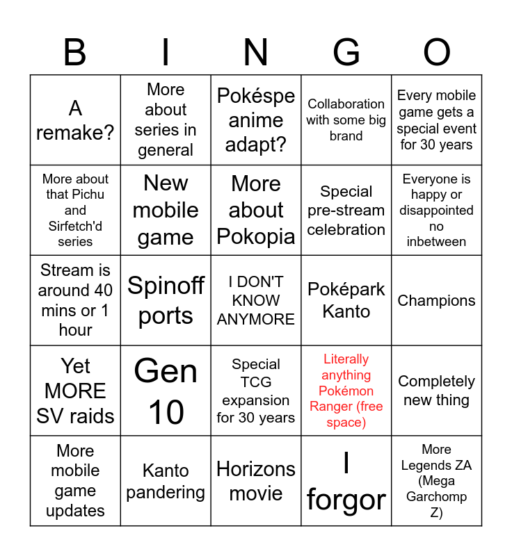 This bingo card has 25 words: Gen 10, Horizons movie, More about Pokopia, More mobile game updates, Every mobile game gets a special event for 30 years, A remake?, More about that Pichu and Sirfetch'd series, More about series in general, Poképark Kanto, Special TCG expansion for 30 years, Special pre-stream celebration, Stream is around 40 mins or 1 hour, Literally anything Pokémon Ranger (free space), Completely new thing, New mobile game, More Legends ZA (Mega Garchomp Z), Champions, Pokéspe anime adapt?, Everyone is happy or disappointed no inbetween, Spinoff ports, I DON'T KNOW ANYMORE, Kanto pandering, Yet MORE SV raids, Collaboration with some big brand and I forgor.