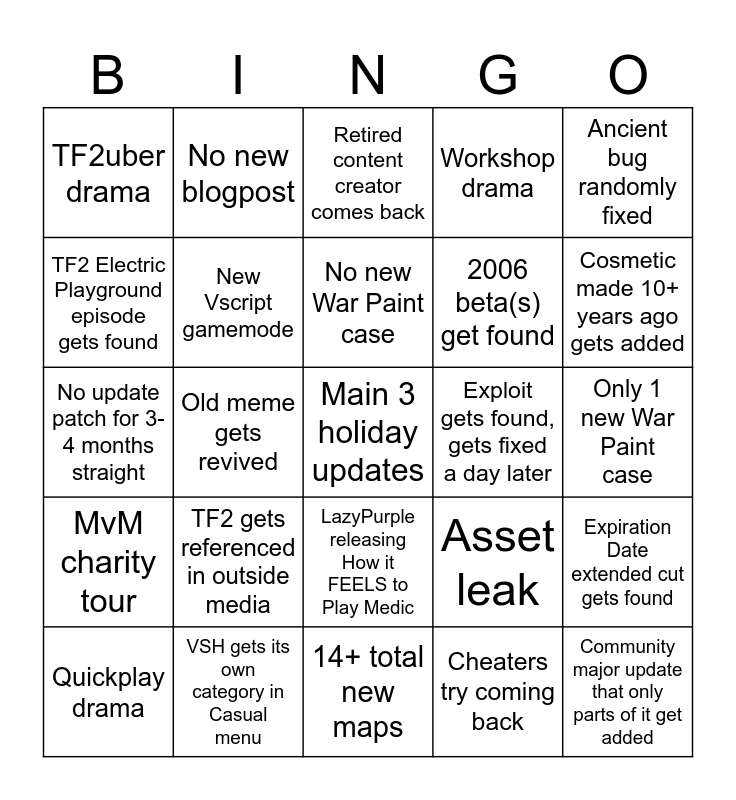 This bingo card has a free space and 24 words: TF2 gets referenced in outside media, VSH gets its own category in Casual menu, No new War Paint case, Quickplay drama, Ancient bug randomly fixed, TF2uber drama, TF2 Electric Playground episode gets found, No new blogpost, Exploit gets found, gets fixed a day later, LazyPurple releasing How it FEELS to Play Medic, 2006 beta(s) get found, No update patch for 3-4 months straight, Asset leak, Expiration Date extended cut gets found, New Vscript gamemode, Cheaters try coming back, Only 1 new War Paint case, Retired content creator comes back, Cosmetic made 10+ years ago gets added, Old meme gets revived, Community major update that only parts of it get added, MvM charity tour, Workshop drama and 14+ total new maps.