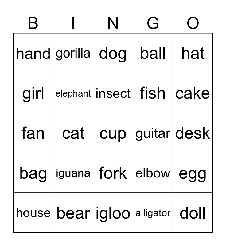 This bingo card has 25 words: iguana, igloo, insect, house, hat, hand, girl, gorilla, guitar, fork, fish, fan, elbow, egg, elephant, doll, desk, dog, cake, cat, cup, bear, bag, ball and alligator.