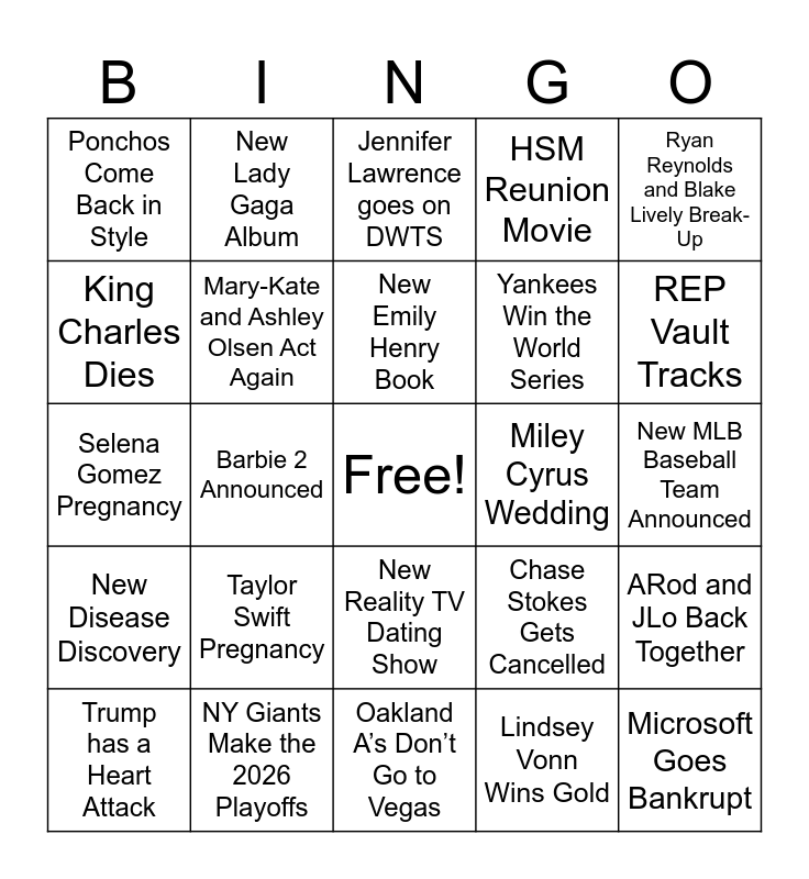 This bingo card has a free space and 24 words: Taylor Swift Pregnancy, NY Giants Make the 2026 Playoffs, New Emily Henry Book, Trump has a Heart Attack, Ryan Reynolds and Blake Lively Break-Up, Ponchos Come Back in Style, King Charles Dies, New Lady Gaga Album, Miley Cyrus Wedding, New Reality TV Dating Show, Yankees Win the World Series, Selena Gomez Pregnancy, Chase Stokes Gets Cancelled, ARod and JLo Back Together, Mary-Kate and Ashley Olsen Act Again, Lindsey Vonn Wins Gold, New MLB Baseball Team Announced, Jennifer Lawrence goes on DWTS, REP Vault Tracks, Barbie 2 Announced, Microsoft Goes Bankrupt, New Disease Discovery, HSM Reunion Movie and Oakland A’s Don’t Go to Vegas.