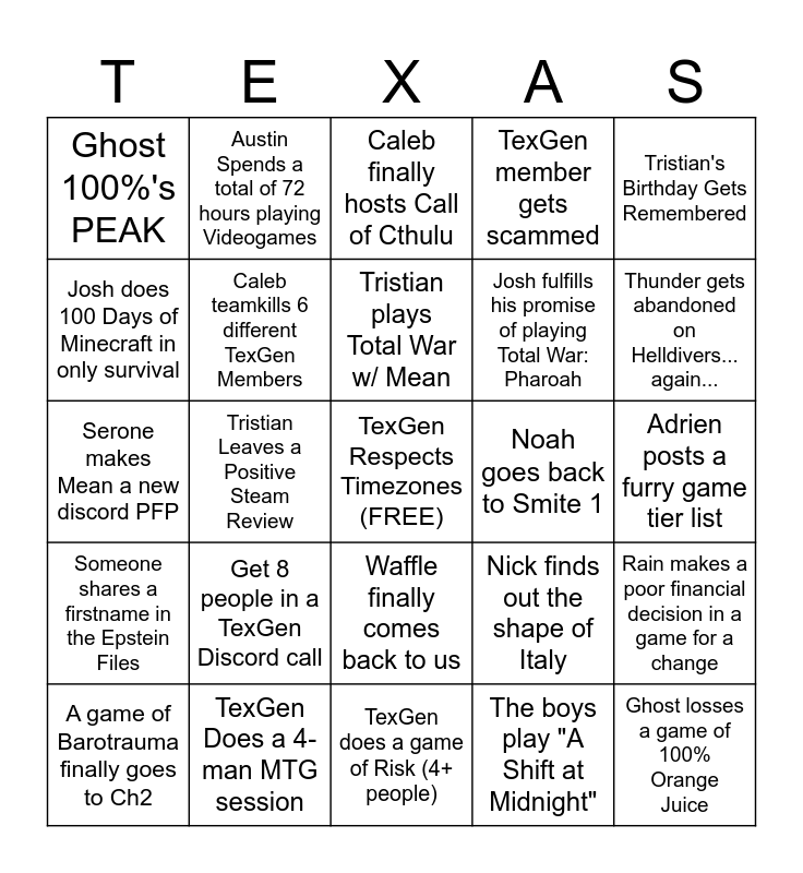 This bingo card has a free space and 24 words: Get 8 people in a TexGen Discord call, TexGen Does a 4-man MTG session, Tristian plays Total War w/ Mean, A game of Barotrauma finally goes to Ch2, Tristian's Birthday Gets Remembered, Ghost 100%'s PEAK, Josh does 100 Days of Minecraft in only survival, Austin Spends a total of 72 hours playing Videogames, Noah goes back to Smite 1, Waffle finally comes back to us, Josh fulfills his promise of playing Total War: Pharoah, Serone makes Mean a new discord PFP, Nick finds out the shape of Italy, Rain makes a poor financial decision in a game for a change, Caleb teamkills 6 different TexGen Members, The boys play "A Shift at Midnight", Adrien posts a furry game tier list, Caleb finally hosts Call of Cthulu, Thunder gets abandoned on Helldivers... again..., Tristian Leaves a Positive Steam Review, Ghost losses a game of 100% Orange Juice, Someone shares a firstname in the Epstein Files, TexGen member gets scammed and TexGen does a game of Risk (4+ people).