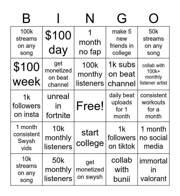 This bingo card has a free space and 24 words: 10k monthly listeners, 50k monthly listeners, 100k monthy listeners, 10k streams on any song, 50k streams on any song, 100k streams on any song, $100 week, $100 day, daily beat uploads for 1 month, start college, 1k subs on beat channel, 1k followers on insta, 1k followers on tiktok, 1 month no social media, get monetized on beat channel, collab with bunii, consistent workouts for a month, 1 month no fap, collab with 100k+ monthly listener artist, unreal in fortnite, immortal in valorant, 1 month consistent Swysh vids, make 5 new friends in college and get monetized on swysh.