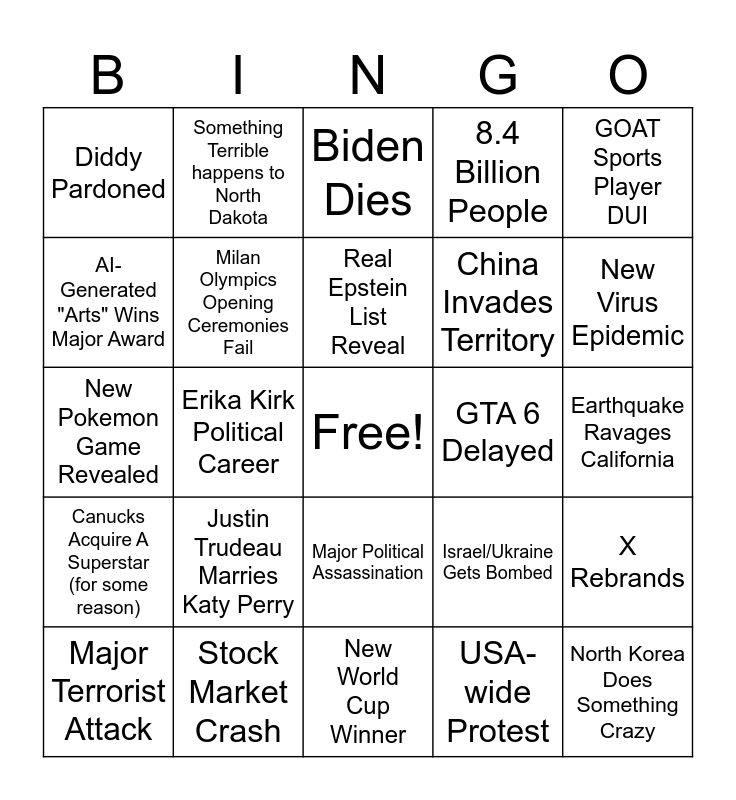 This bingo card has a free space and 24 words: Justin Trudeau Marries Katy Perry, Stock Market Crash, Real Epstein List Reveal, Major Terrorist Attack, GOAT Sports Player DUI, Diddy Pardoned, AI-Generated "Arts" Wins Major Award, Something Terrible happens to North Dakota, GTA 6 Delayed, Major Political Assassination, China Invades Territory, New Pokemon Game Revealed, Israel/Ukraine Gets Bombed, X Rebrands, Milan Olympics Opening Ceremonies Fail, USA-wide Protest, Earthquake Ravages California, Biden Dies, New Virus Epidemic, Erika Kirk Political Career, North Korea Does Something Crazy, Canucks Acquire A Superstar (for some reason), 8.4 Billion People and New World Cup Winner.