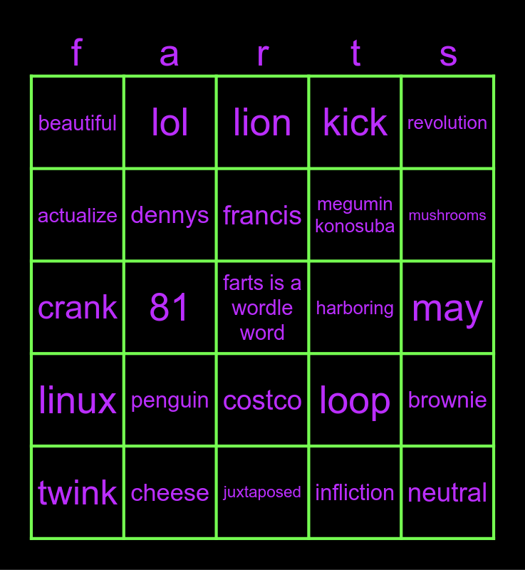 This bingo card has a free space and 24 words: penguin, cheese, francis, twink, revolution, beautiful, actualize, lol, harboring, costco, megumin konosuba, crank, loop, brownie, dennys, infliction, may, lion, mushrooms, 81, neutral, linux, kick and juxtaposed.