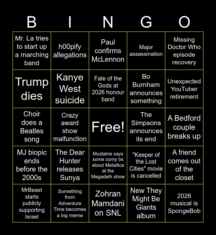 This bingo card has a free space and 24 words: The Dear Hunter releases Sunya, Something from Adventure Time becomes a big meme, Fate of the Gods at 2026 honour band, MrBeast starts publicly supporting Israel, Missing Doctor Who episode recovery, Mr. La tries to start up a marching band, Trump dies, h00pify allegations, The Simpsons announces its end, Mustaine says some corny bs about Metallica at the Megadeth show, Bo Burnham announces something, Choir does a Beatles song, "Keeper of the Lost Cities" movie is cancelled, A friend comes out of the closet, Kanye West suicide, New They Might Be Giants album, A Bedford couple breaks up, Paul confirms McLennon, Unexpected YouTuber retirement, Crazy award show malfunction, 2026 musical is SpongeBob, MJ biopic ends before the 2000s, Major assassination and Zohran Mamdani on SNL.