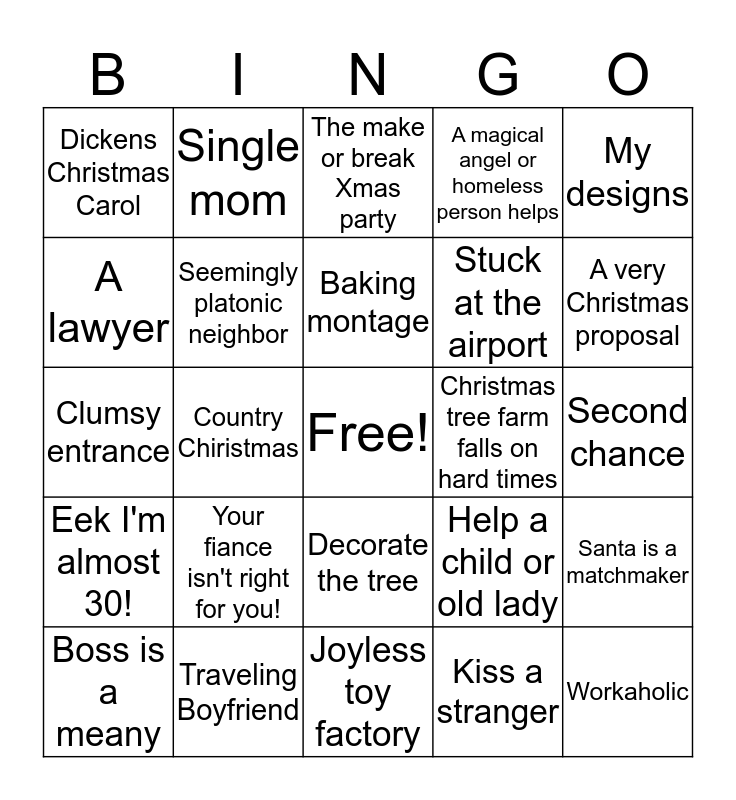 This bingo card has a free space and 26 words: Decorate the tree, Kiss a stranger, Baking montage, Traveling Boyfriend, My designs, Dickens Christmas Carol, A lawyer, Single mom, Second chance, Help a child or old lady, Stuck at the airport, Clumsy entrance, Santa is a matchmaker, Boss is a meany, Country Chiristmas, Big city hustle-bustle, A magical angel or homeless person helps, Eek I'm almost 30!, The make or break Xmas party, Workaholic, A very Christmas proposal, Joyless toy factory, Christmas tree farm falls on hard times, Your fiance isn't right for you!, Seemingly platonic neighbor and An inn.